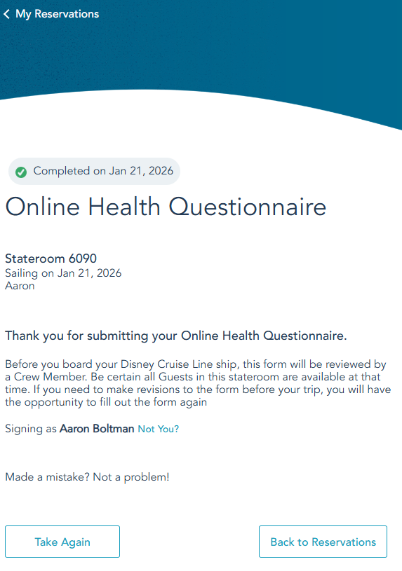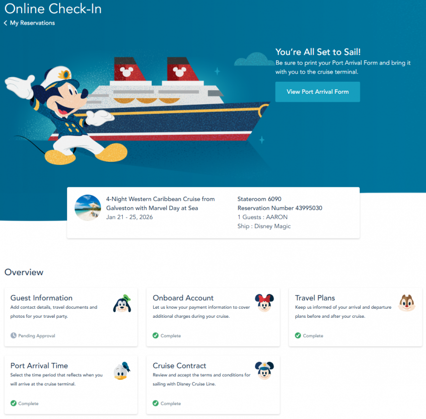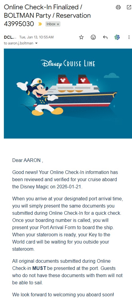 Email received from Disney Cruise Line stating my check-in was finalized.