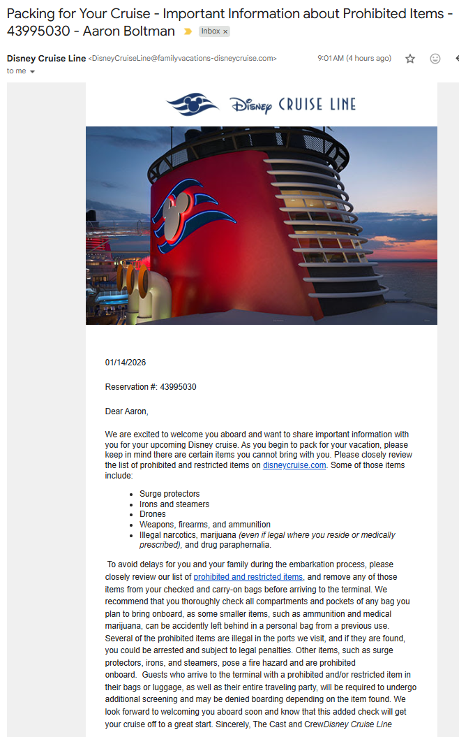 Email received from Disney Cruise Line about what NOT to pack for the cruise. Yes, they don’t like drones either, just like NCL.