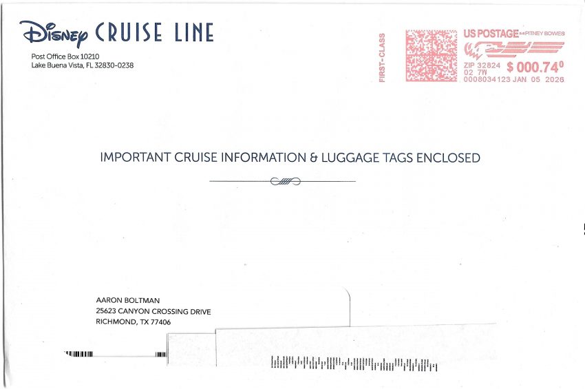 Since I checked in early enough, I received my luggage tag in the mail for the cruise.
