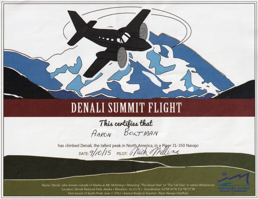 Certificate from Denali Summit Flight