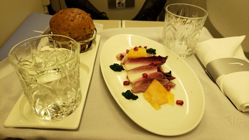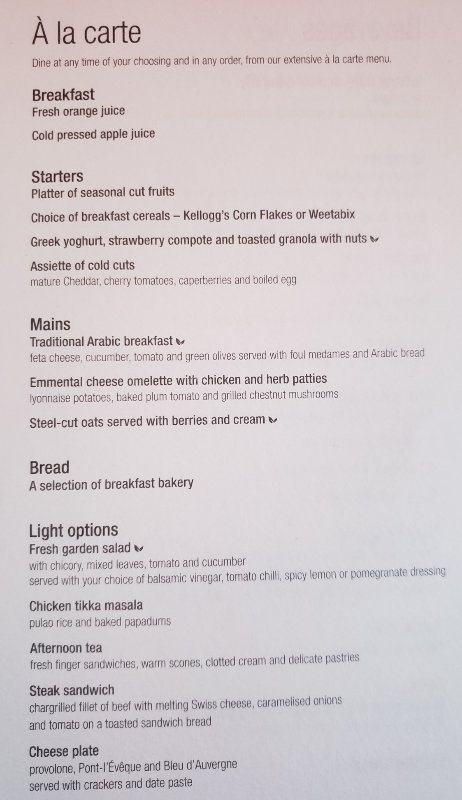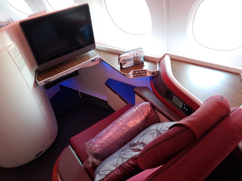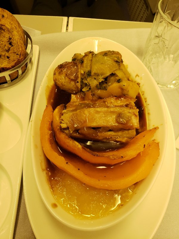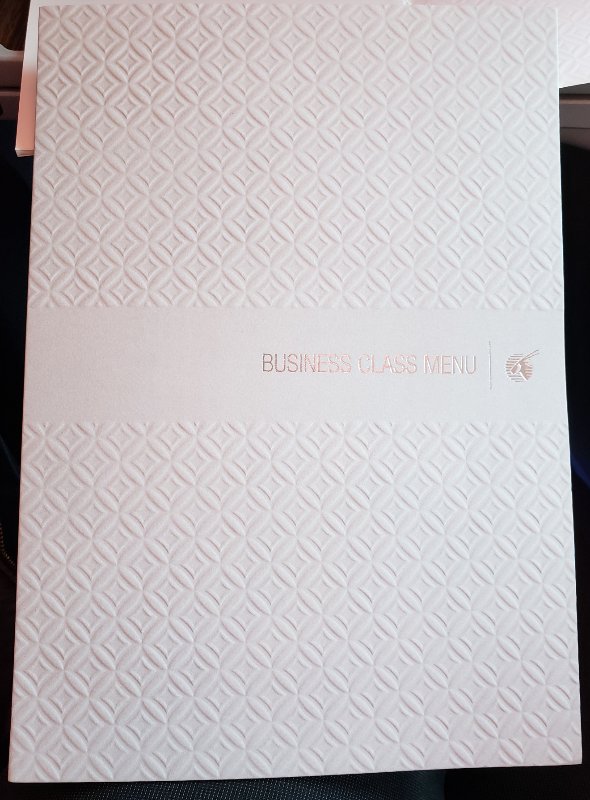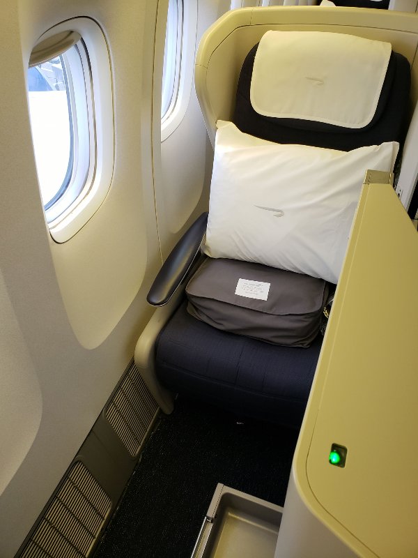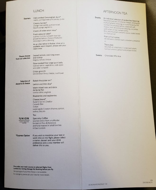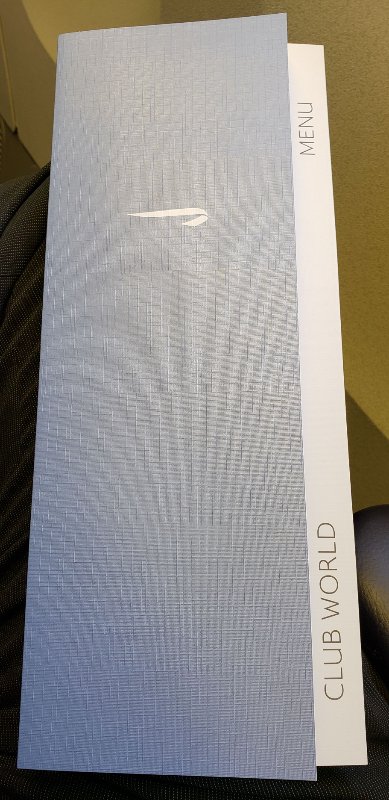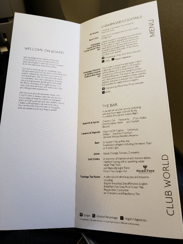 My seat and menu on the British Airways flight. I had the pork belly and it was delicious.