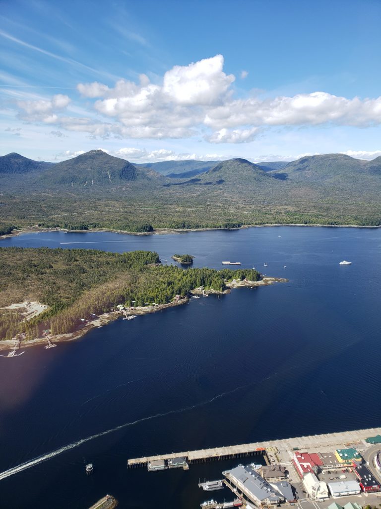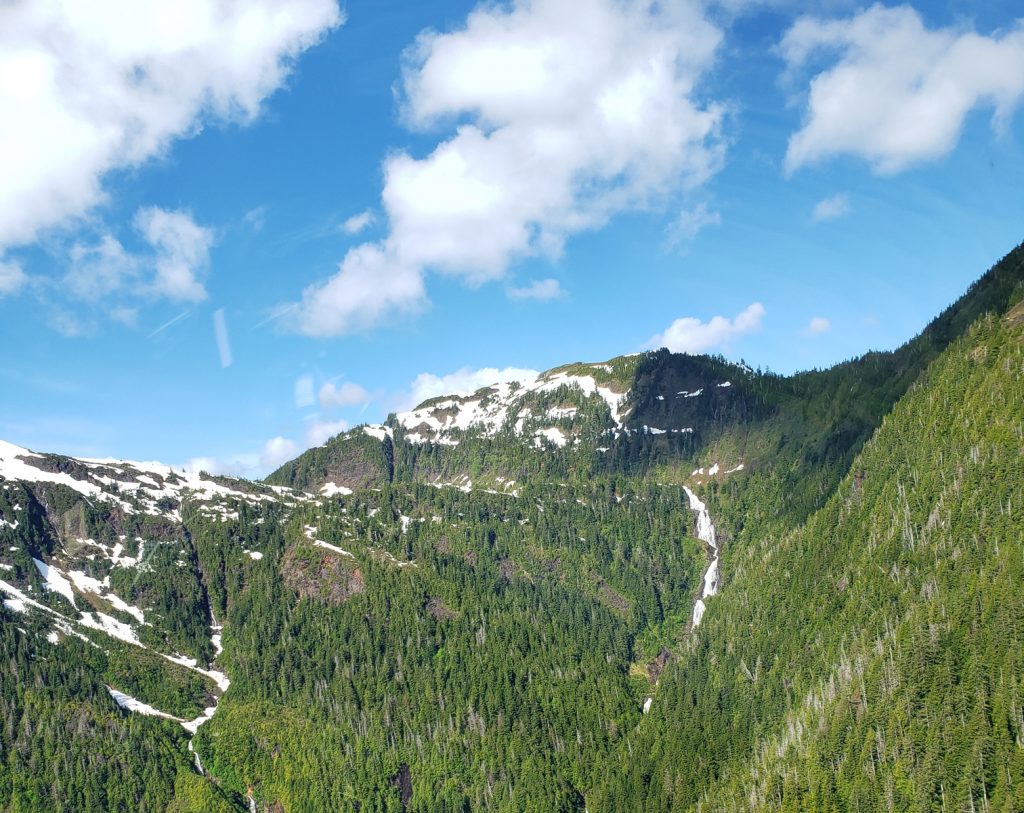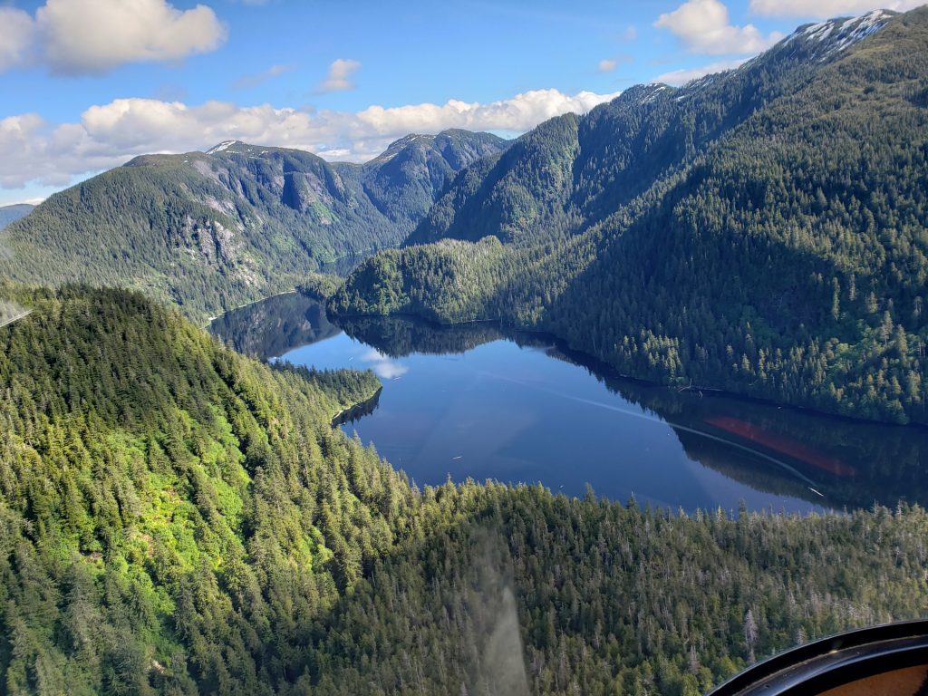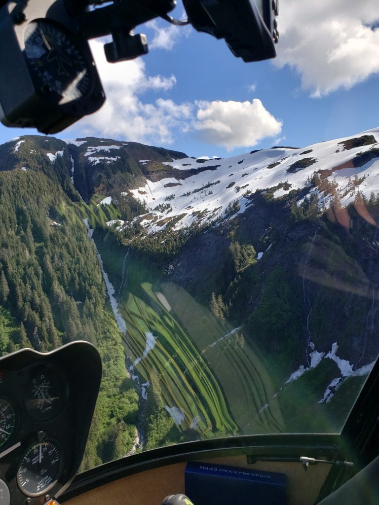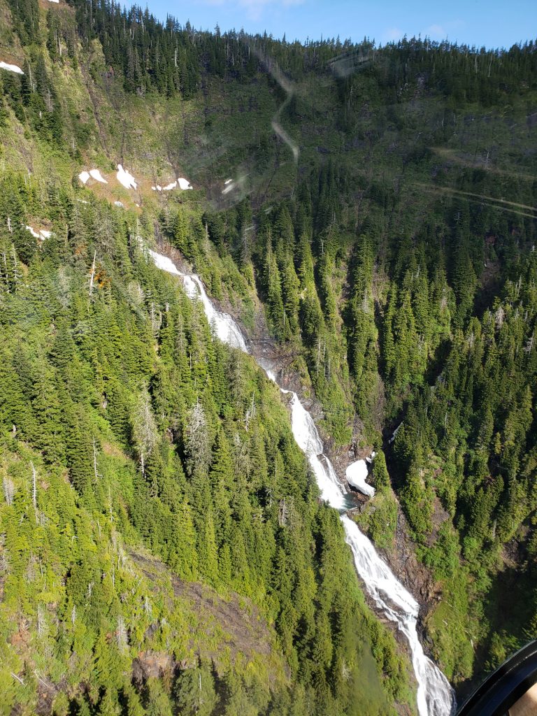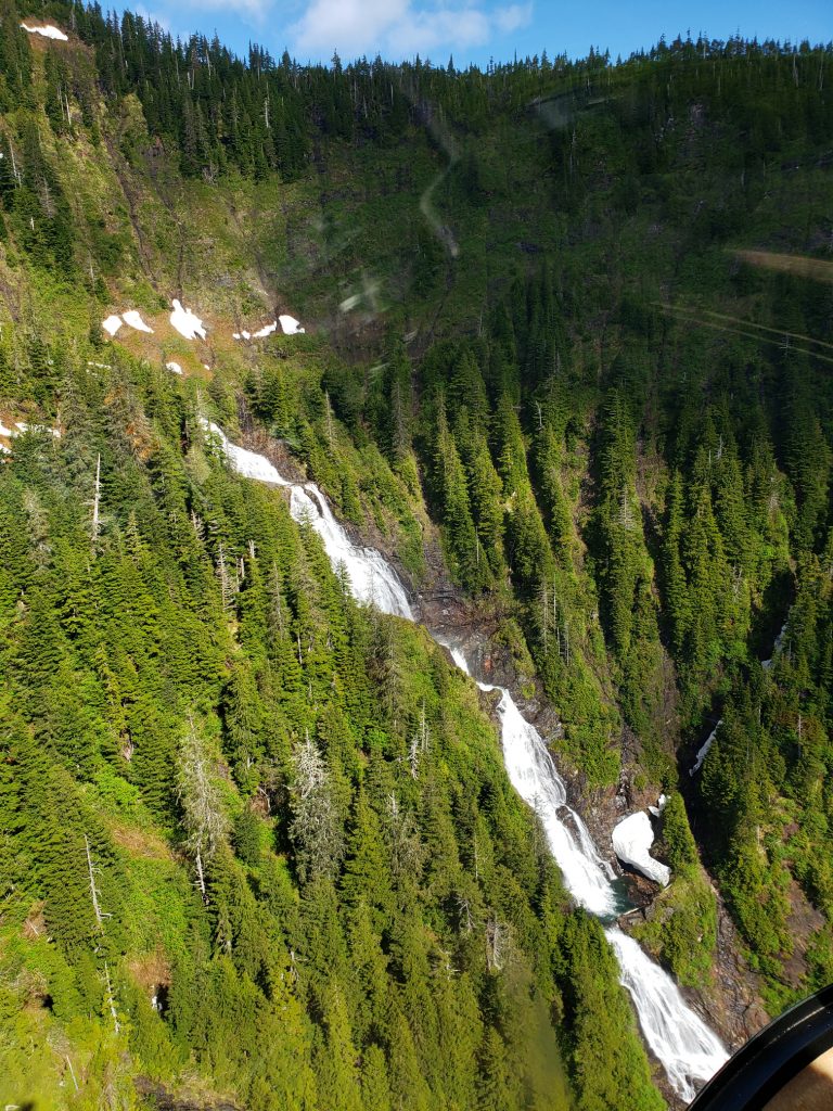 The tour I selected was the Combo Tour, you can see more details in the link below. It flew over the town up near the snow on top of the mountain, over a still mirror lake and over to a large waterfall. After the waterfall we landed on Annette Island on a small platform about 1100 feet above sea level.