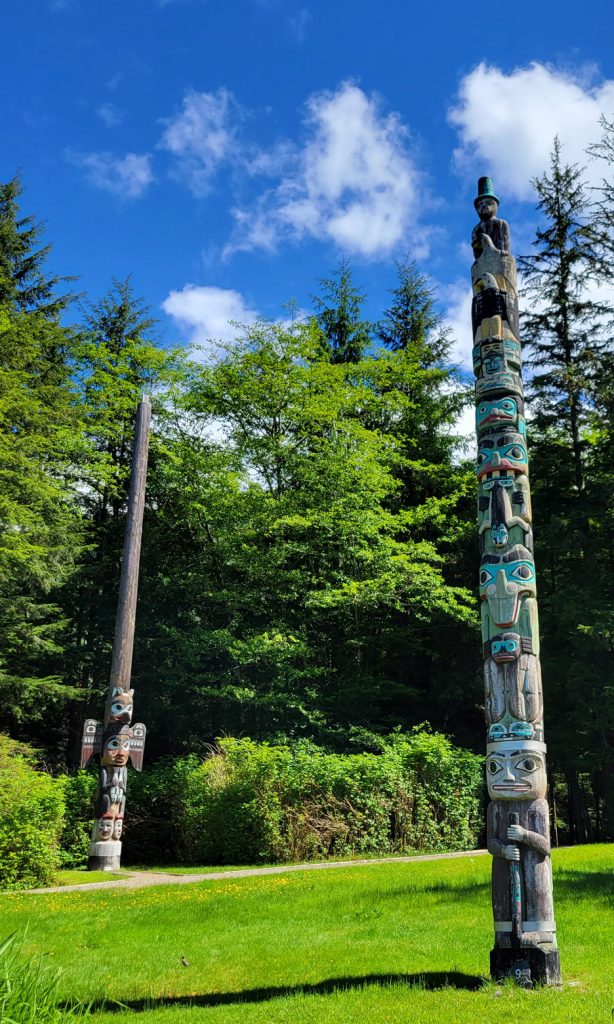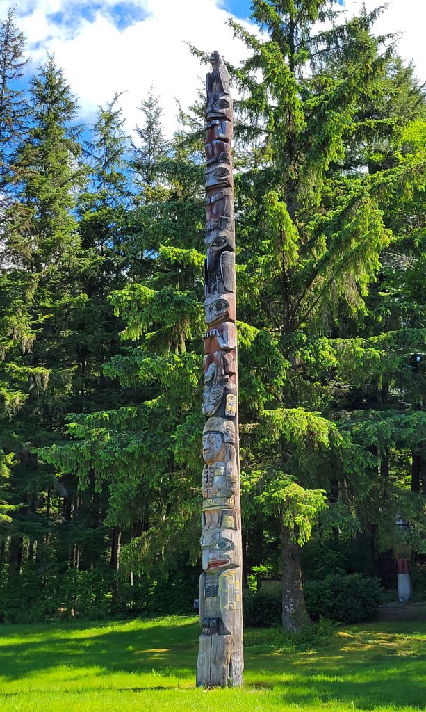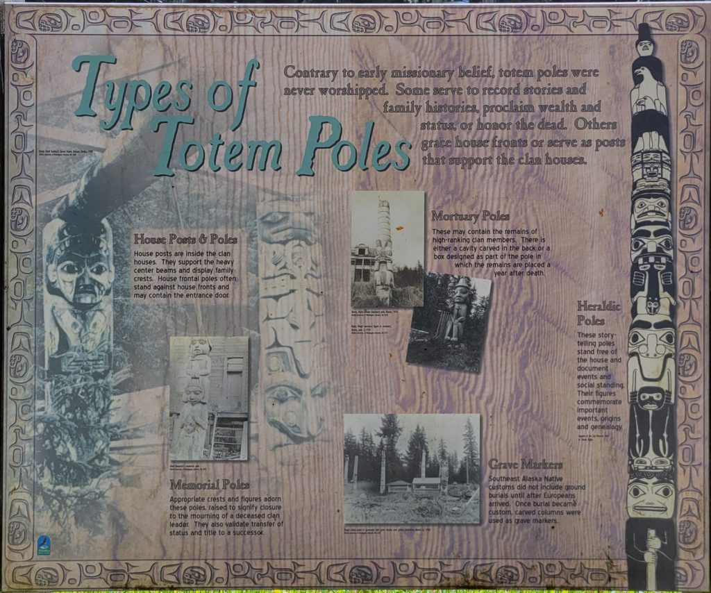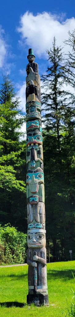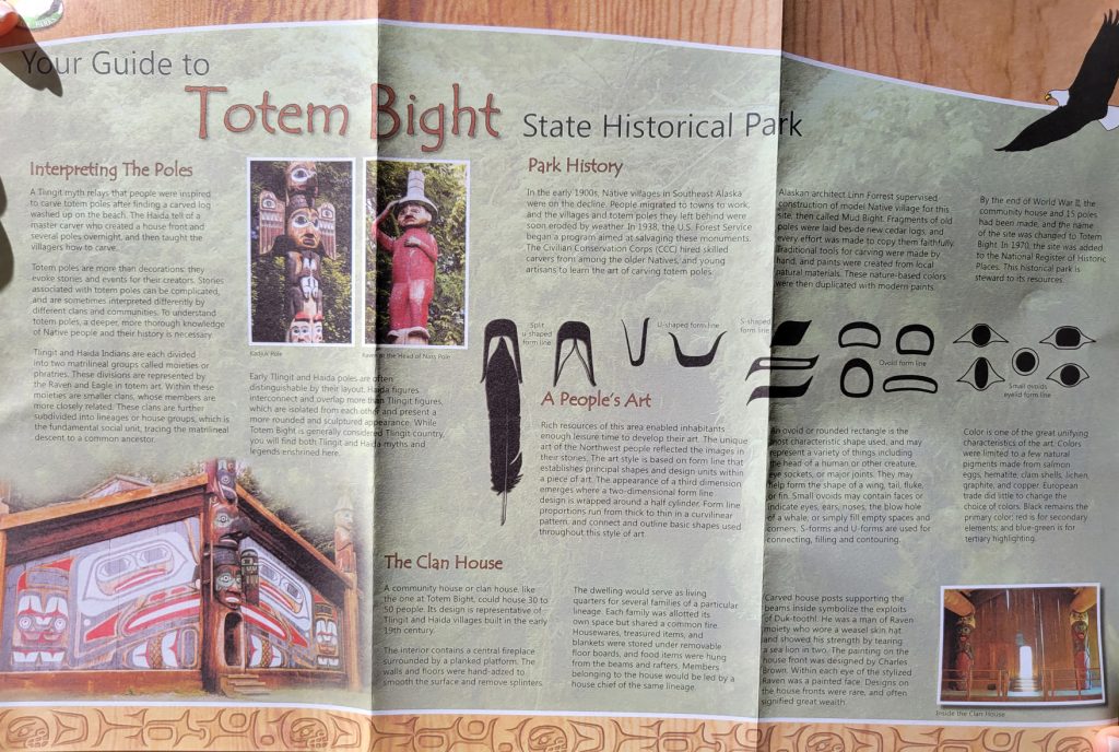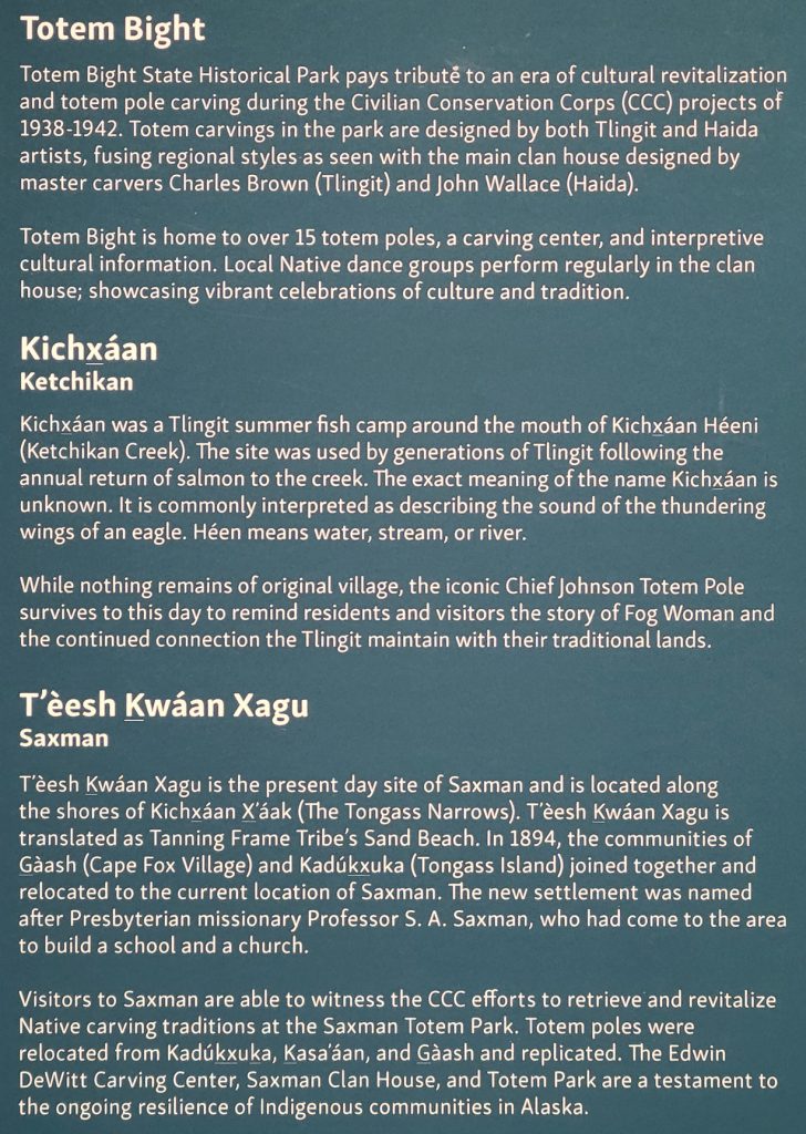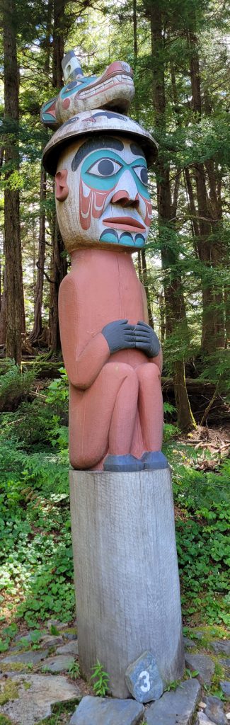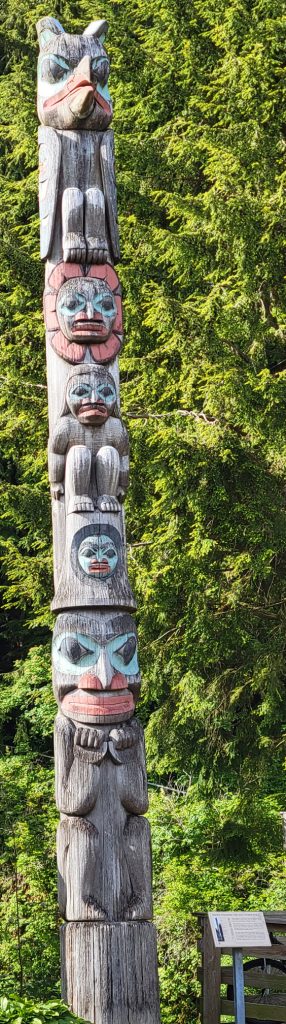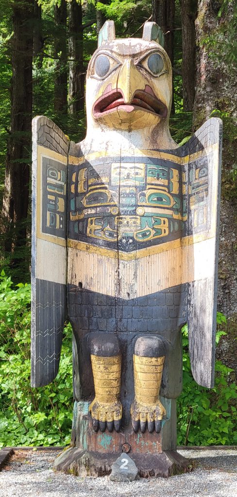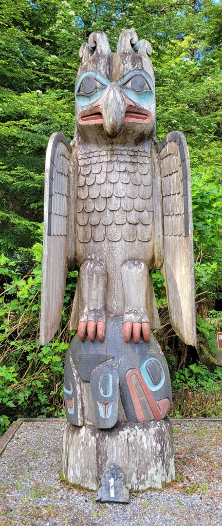 After the helicopter tour they kindly dropped us off at Totem Bight State Park. There were 13 totems and a clan house near what used to be Mud Bight. The name was changed after they added the totems and made it a state park. It was a nice trip, and you can get there by bus. In fact I took the bus back to town. It’s only $2 per person each way, but they don’t give change, so you need to be prepared.