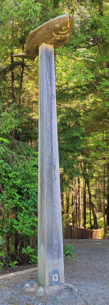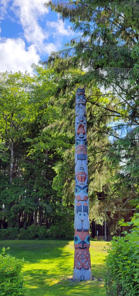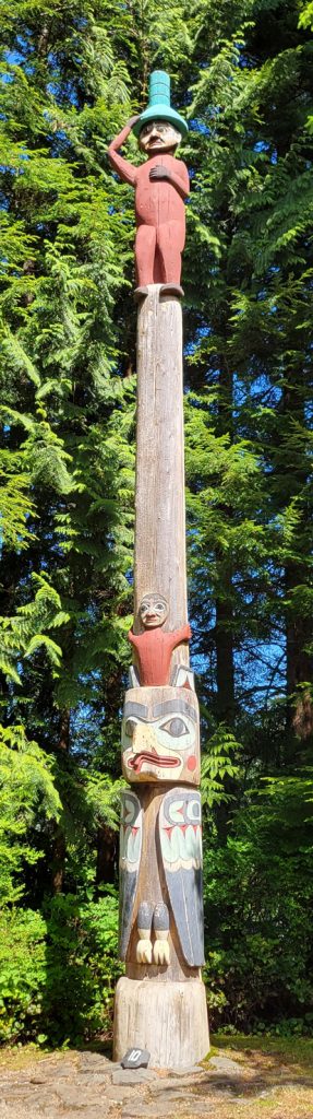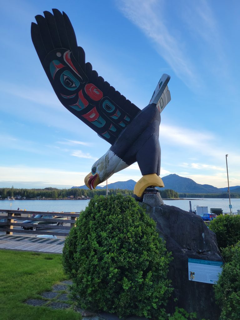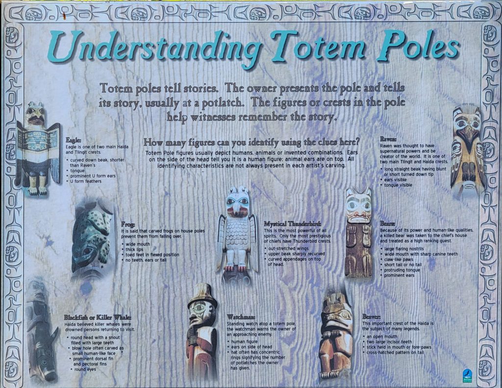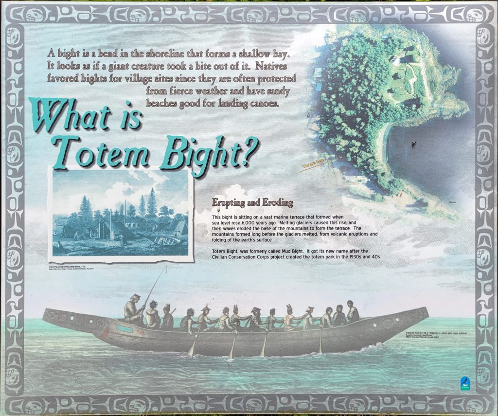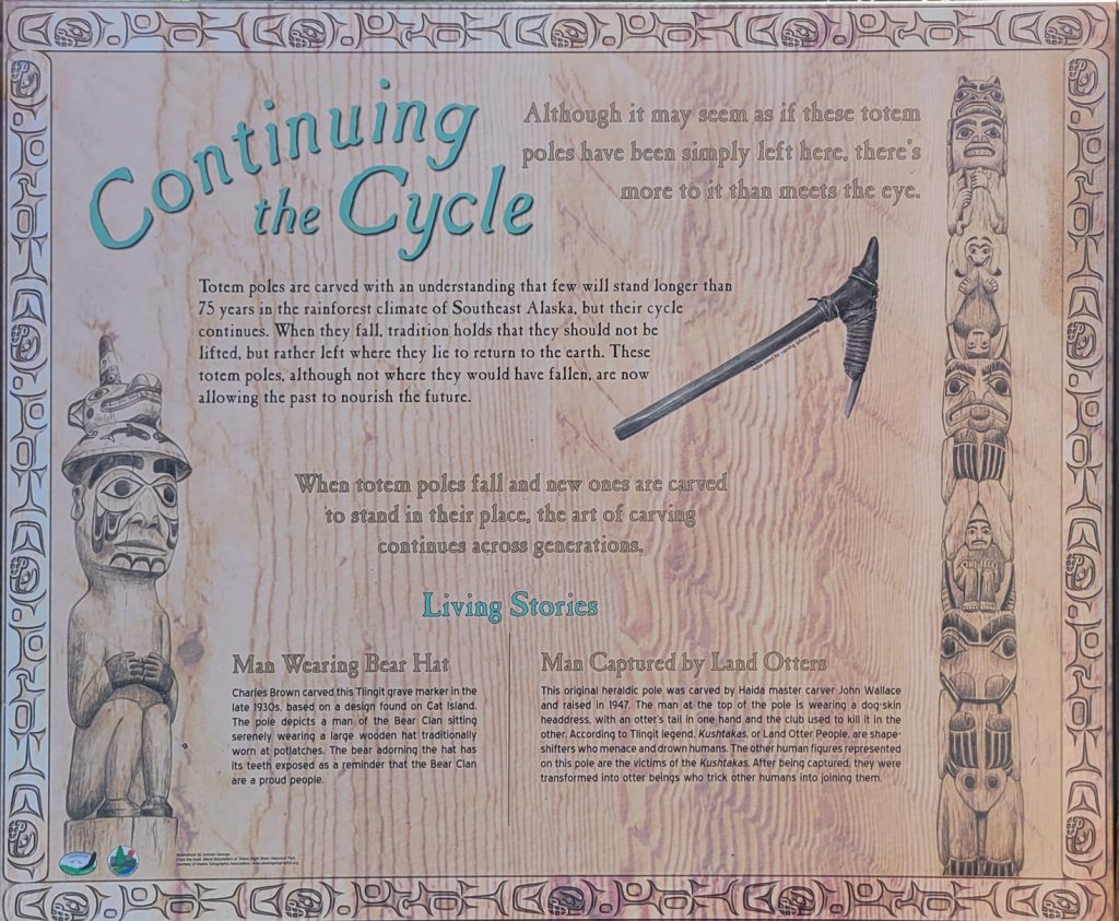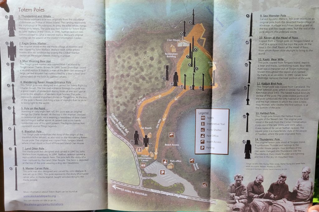 After the helicopter tour they kindly dropped us off at Totem Bight State Park. There were 13 totems and a clan house near what used to be Mud Bight. The name was changed after they added the totems and made it a state park. It was a nice trip, and you can get there by bus. In fact I took the bus back to town. It’s only $2 per person each way, but they don’t give change, so you need to be prepared.