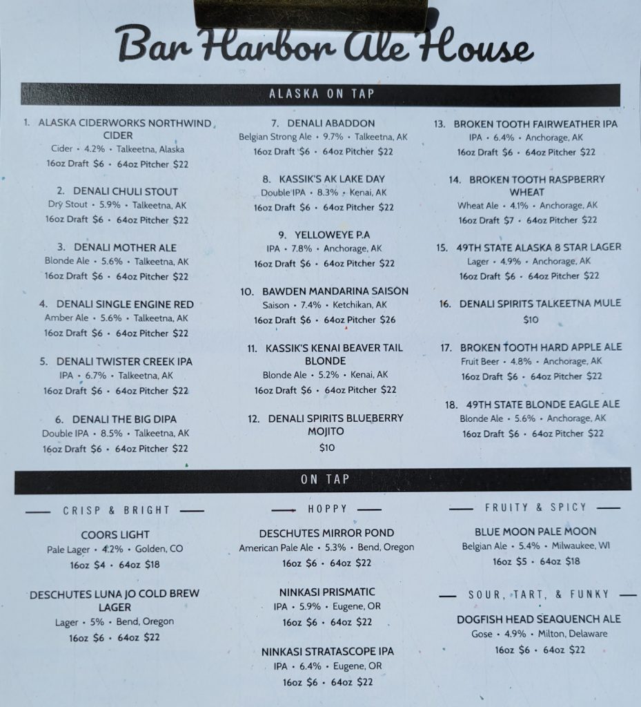 After returning to the hotel to retrieve forgotten items (power bank and cable to keep the phones charged) I had lunch at the Bar Harbor Ale House, which is at berth 4 – where I expect the ship to be on Sunday.