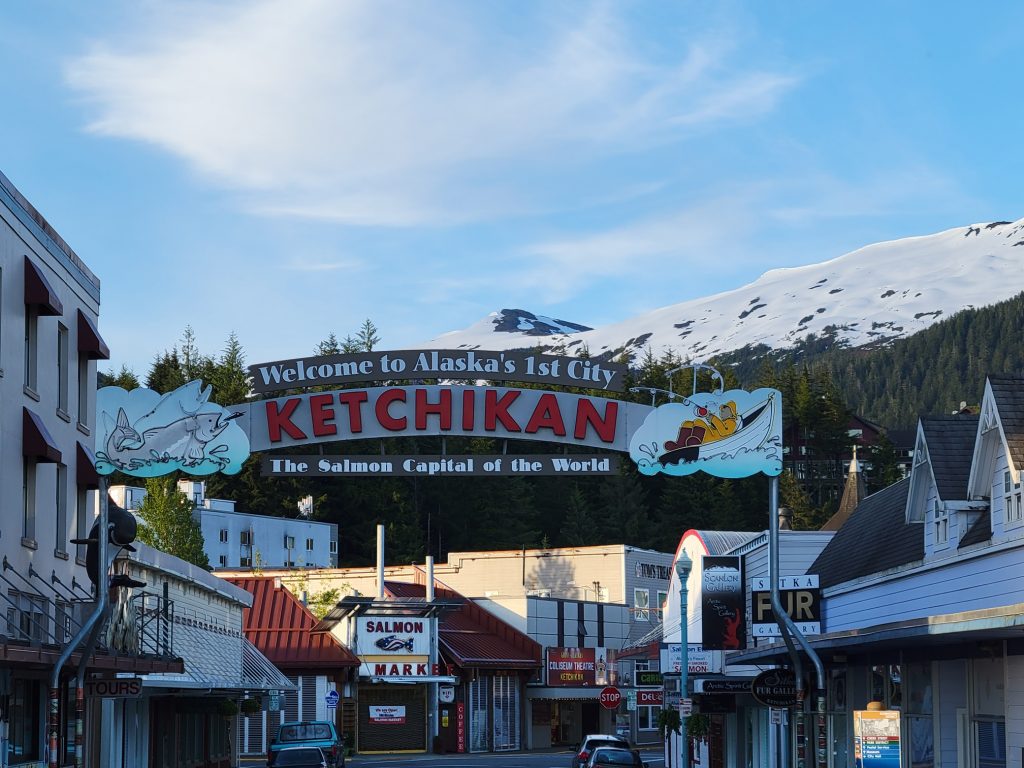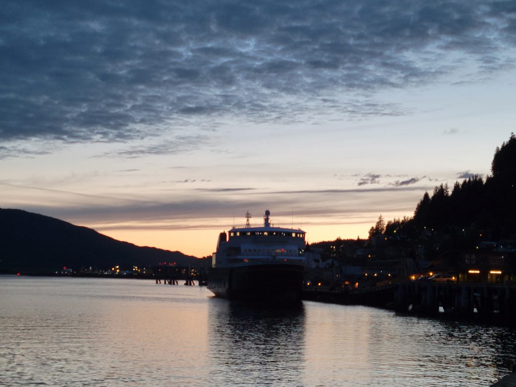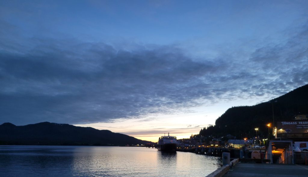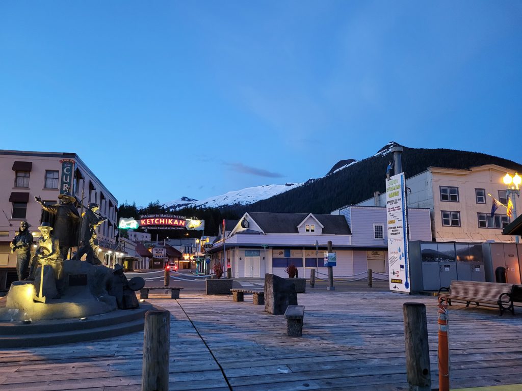 I walked back to the hotel after sunset, but it wasn’t very dark. The lights were on the Ketchikan sign, so I took a couple more pictures.