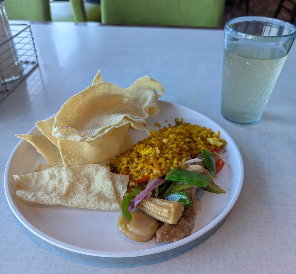 Breakfast isn’t really my thing, so I started with a stop in the buffet for lunch. More Pappadam, and a little sity-fry pork and rice.