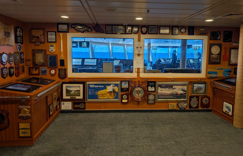 I went up to the bridge observation lounge. They have a bunch of plaques from their first visit to many different ports.