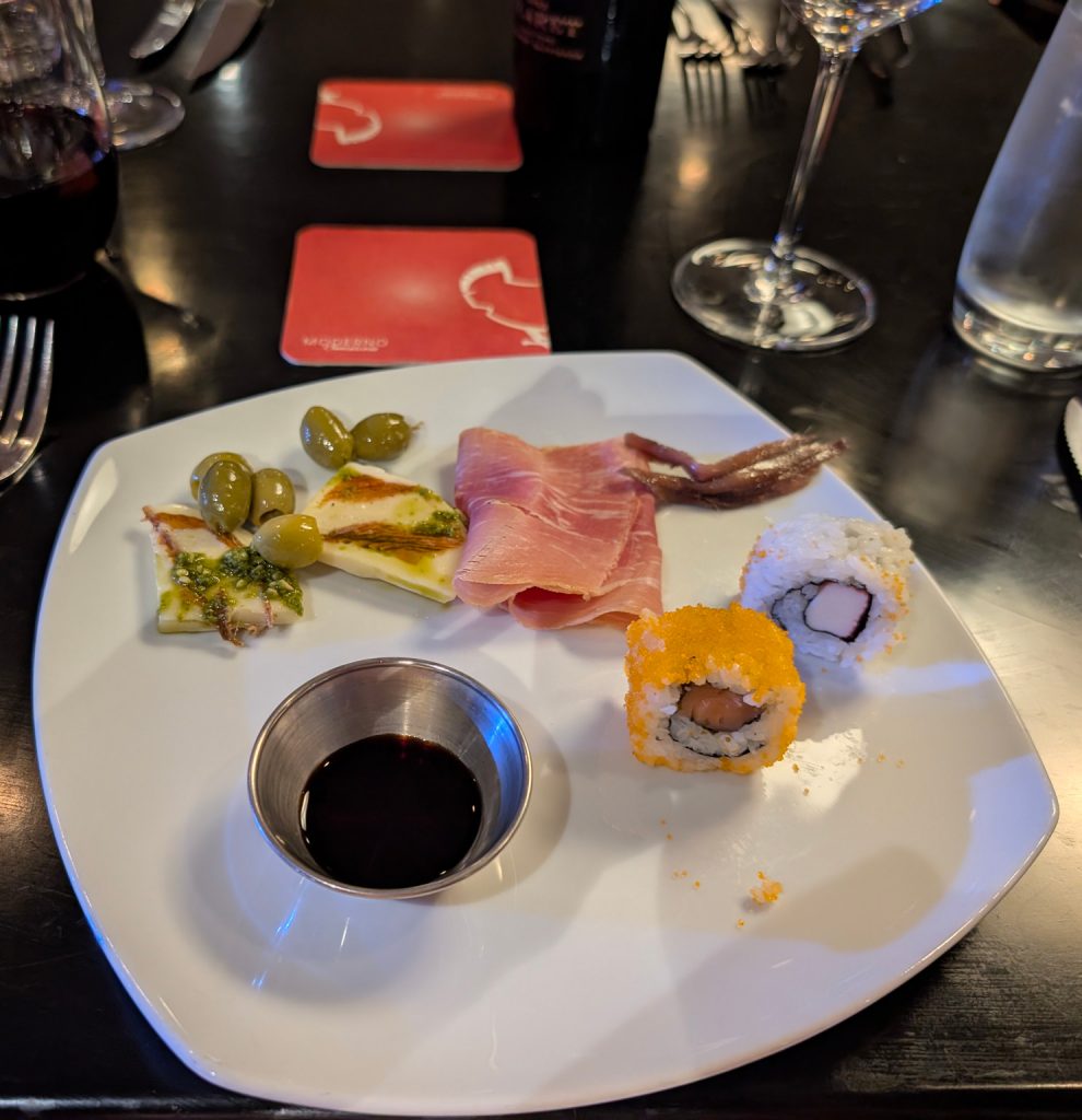 I started with some sushi and ham they called proscuitto, but wasn’t. The grilled cheese was not great, nor were the olives. Not a great start for sure.