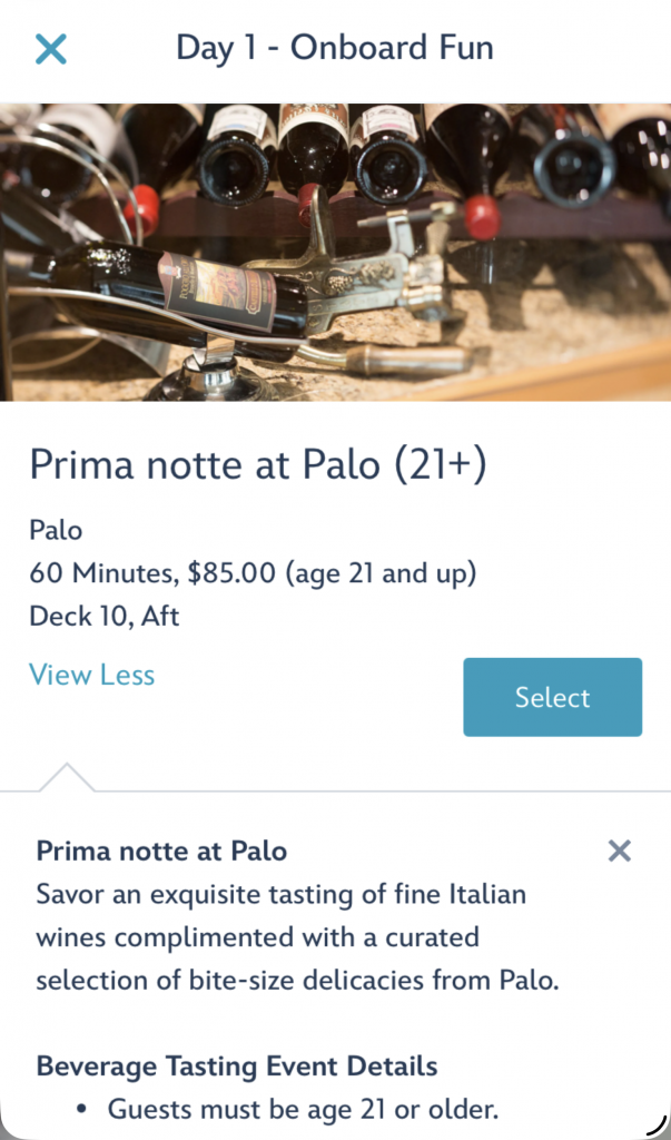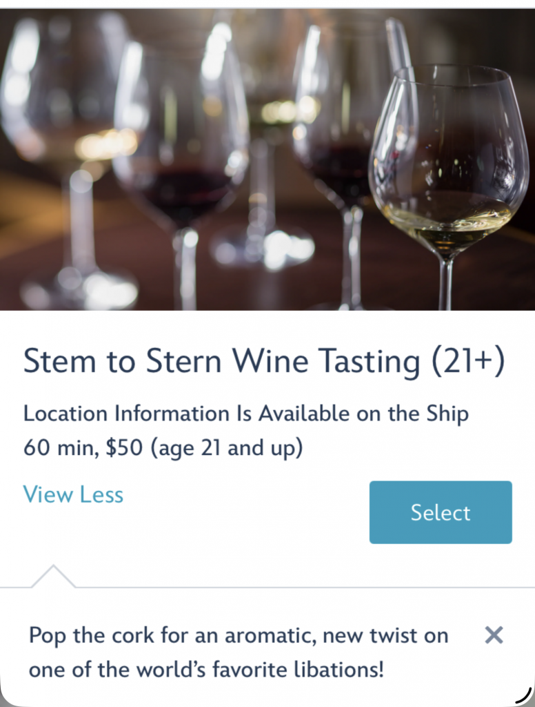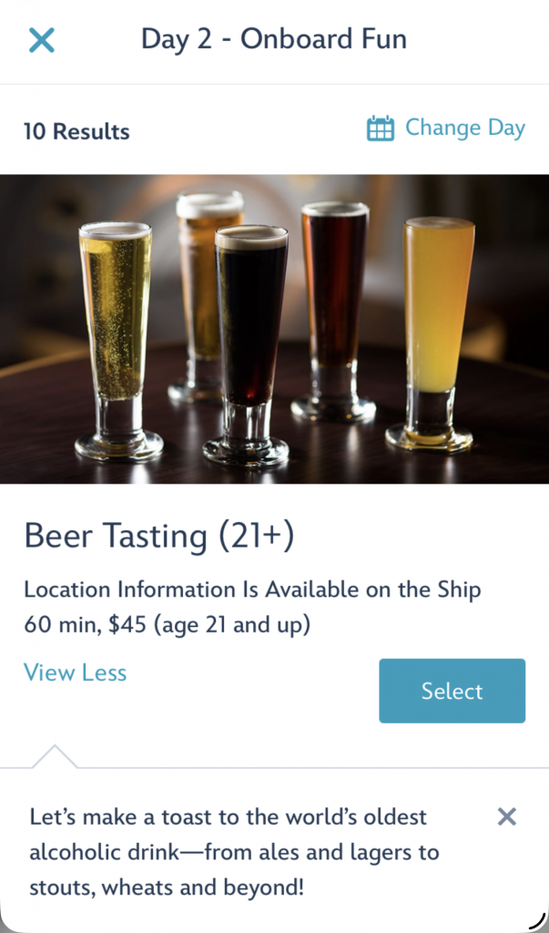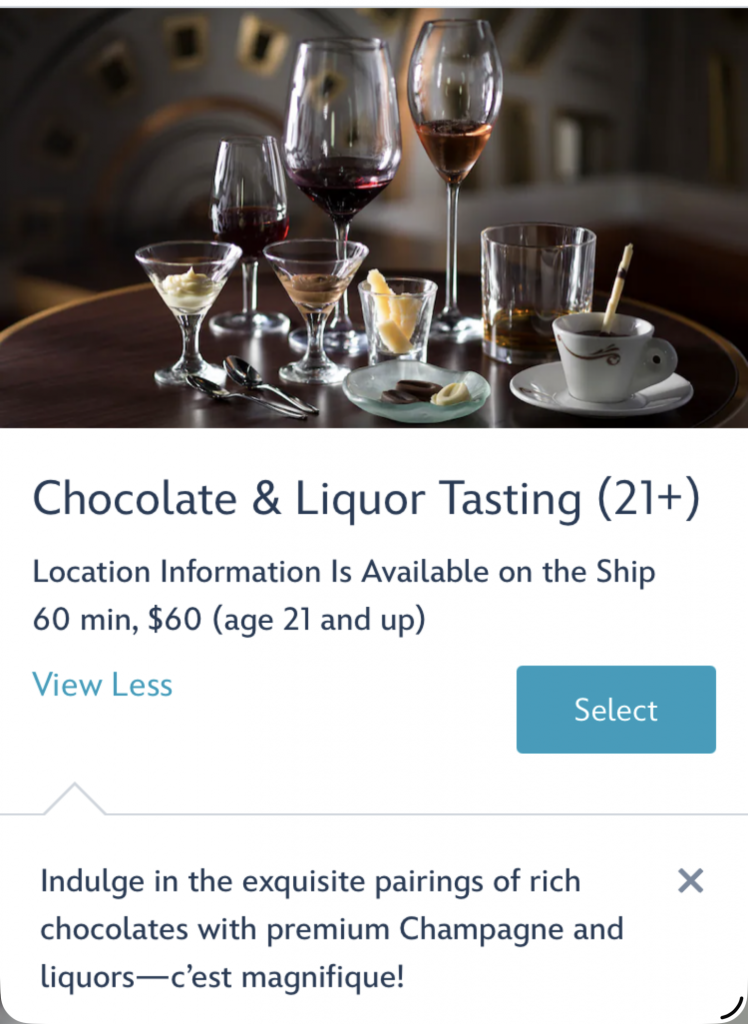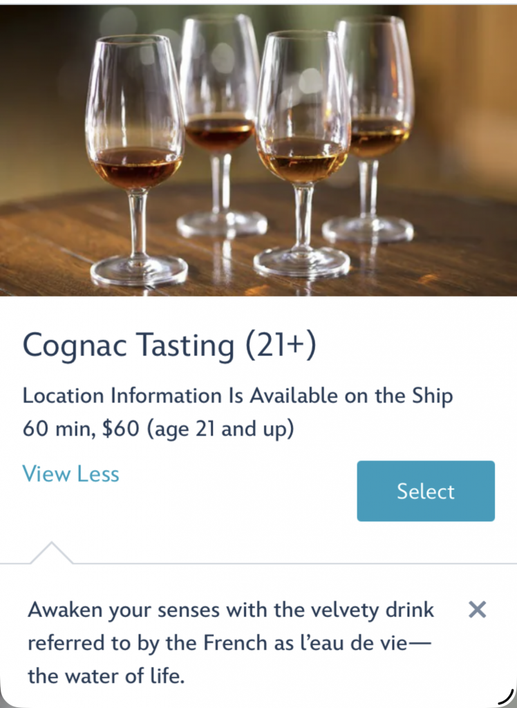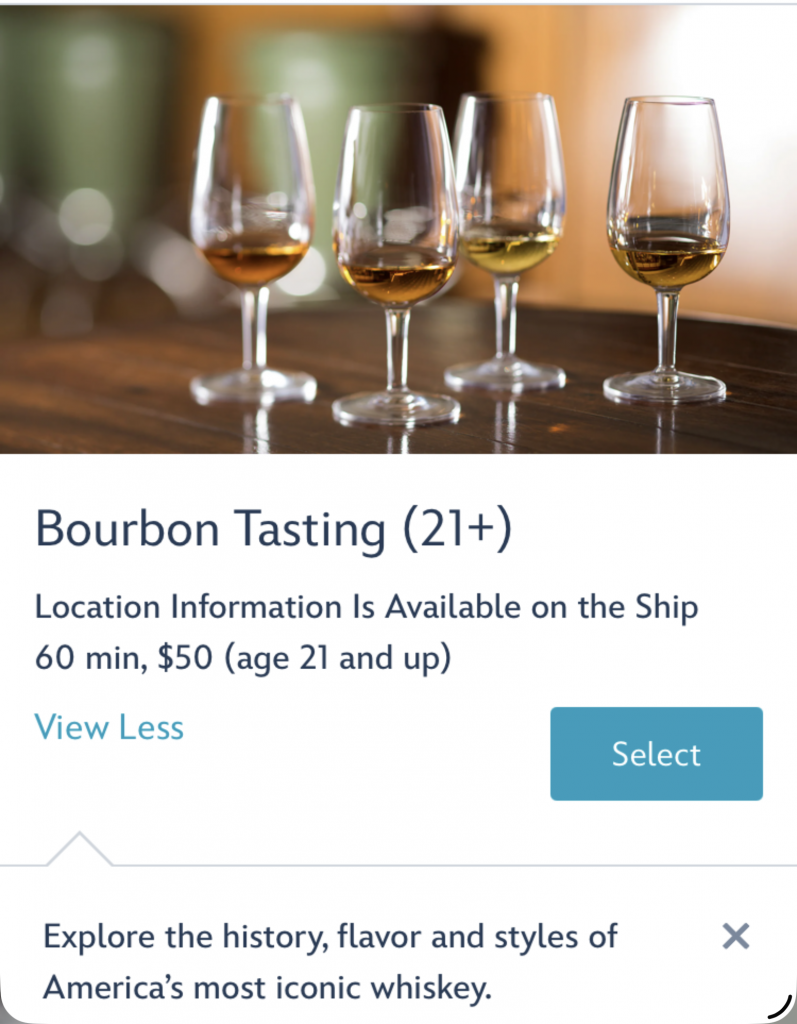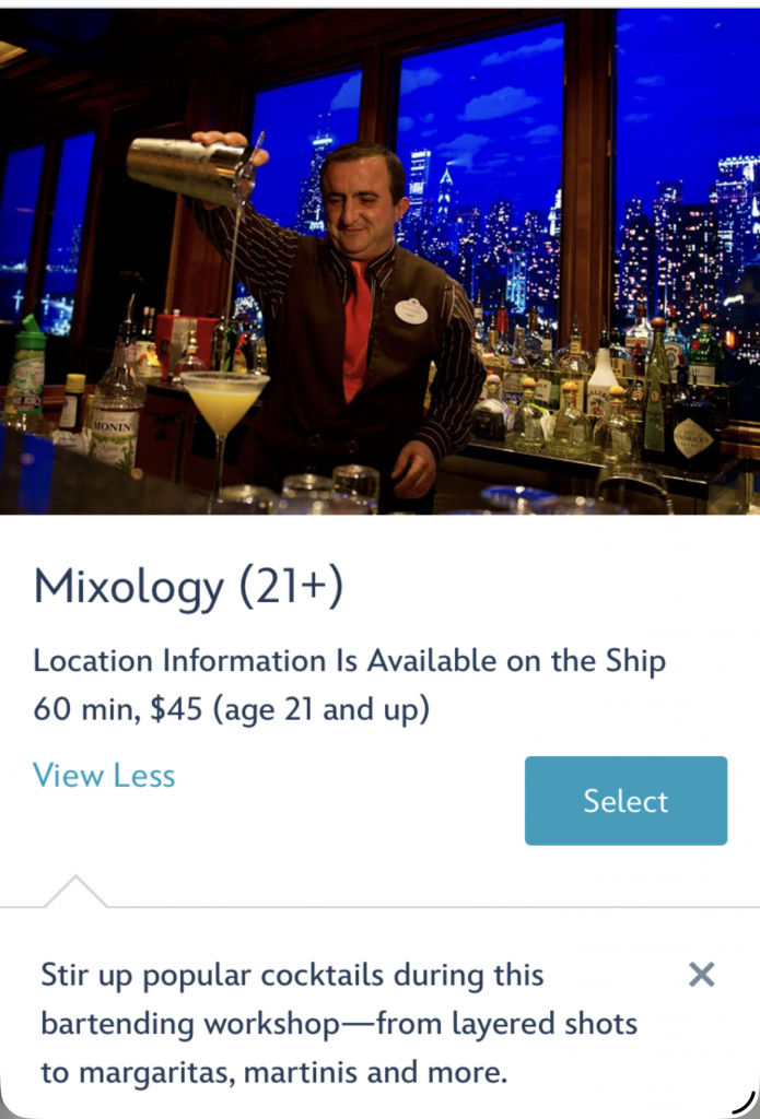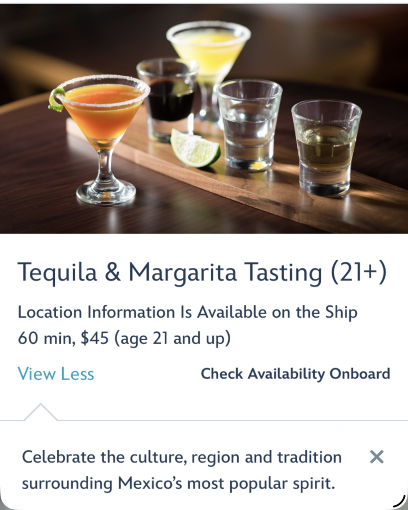 I started looking at what activities were available to book. I was surprised at the amount of adult / alcohol options. Beer, wine, cognac, bourbon, tequila and more. The mixology class was most interesting to me.