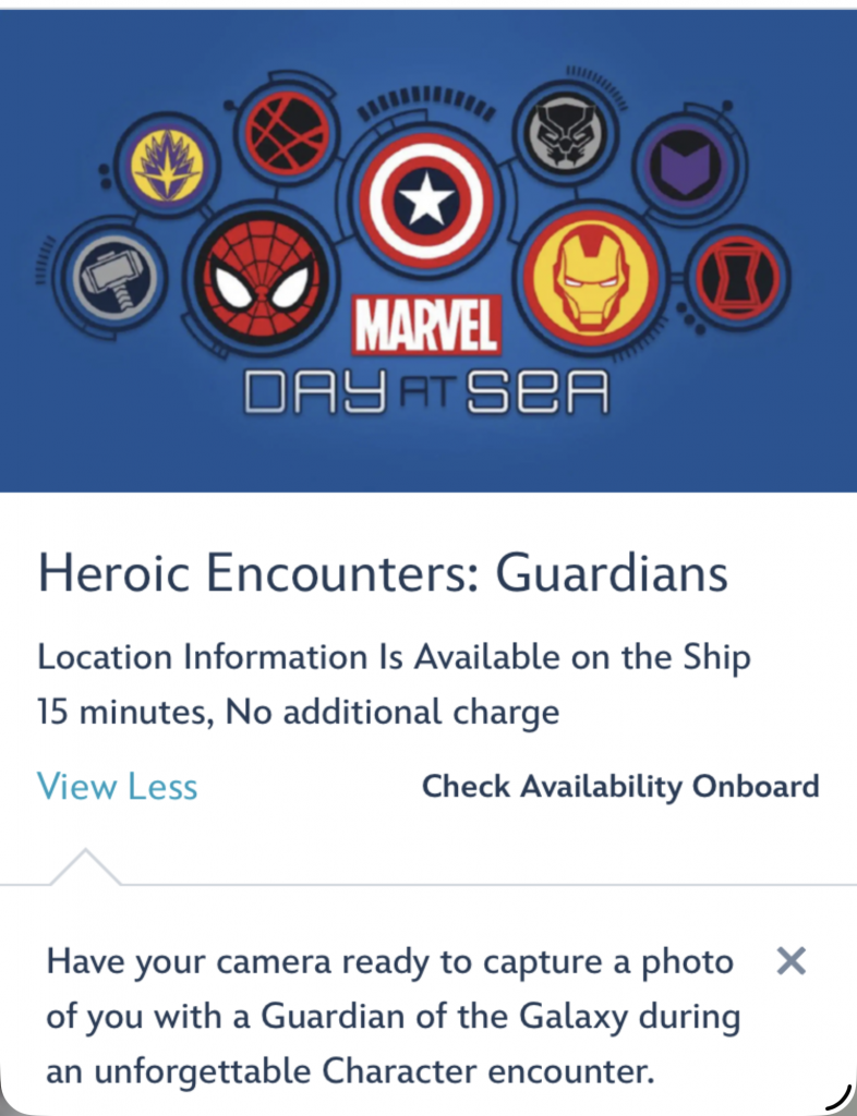 Finally, something for free… you can book a time slot to get a picture with Spider-Man and one of the Guardians of the Galaxy.