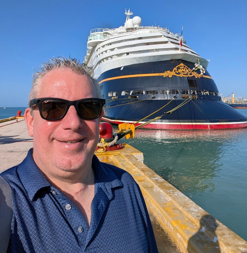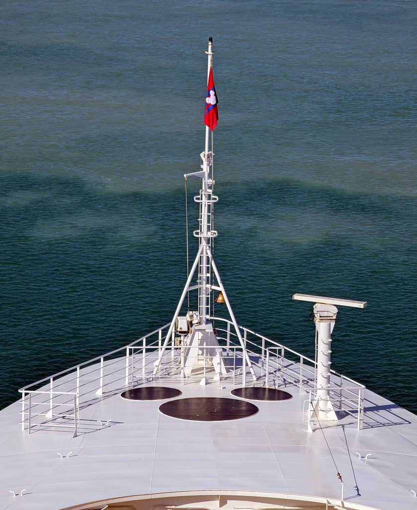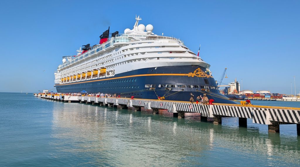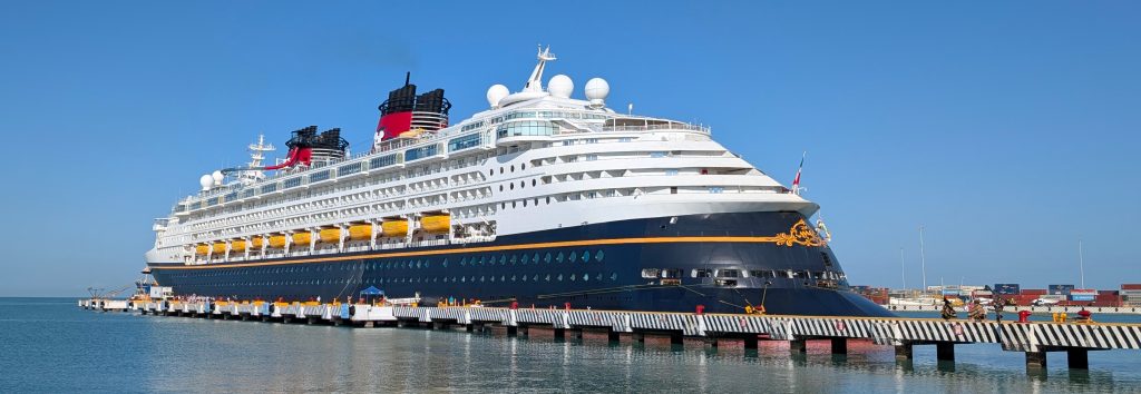 The ship was backed in, so I got a nice picture of the bow with its Mickey Mouse sunlight, the ocean and a tug boat.