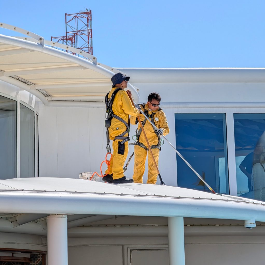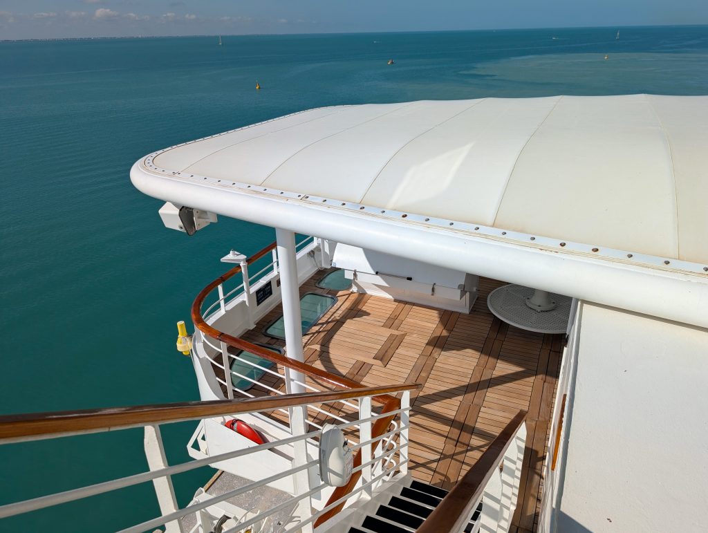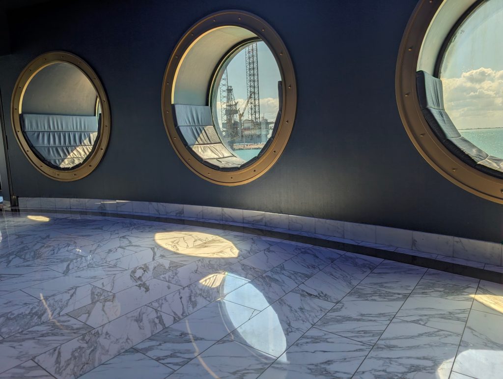 I sat in a porthole in the adult-only area for a bit to enjoy the view with air conditioning. The crew was spraying the windows clean, and I got a cool video with the water running down and eventually the port appearing.