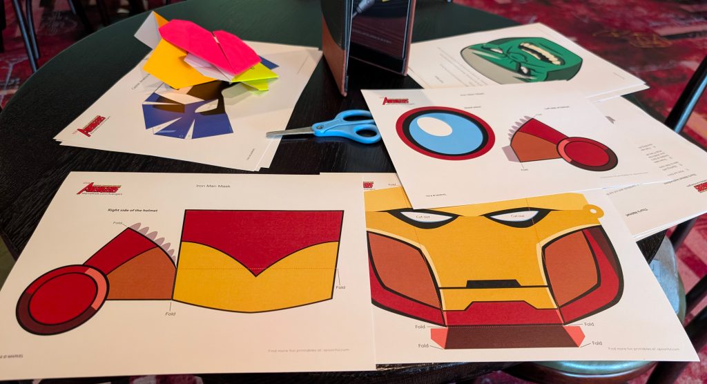 Overlapping the origami class was a family activity to make 3D masks in Soul Cat Lounge. They have me a variety of masks to cut out. Iron Man, Hulk, etc.