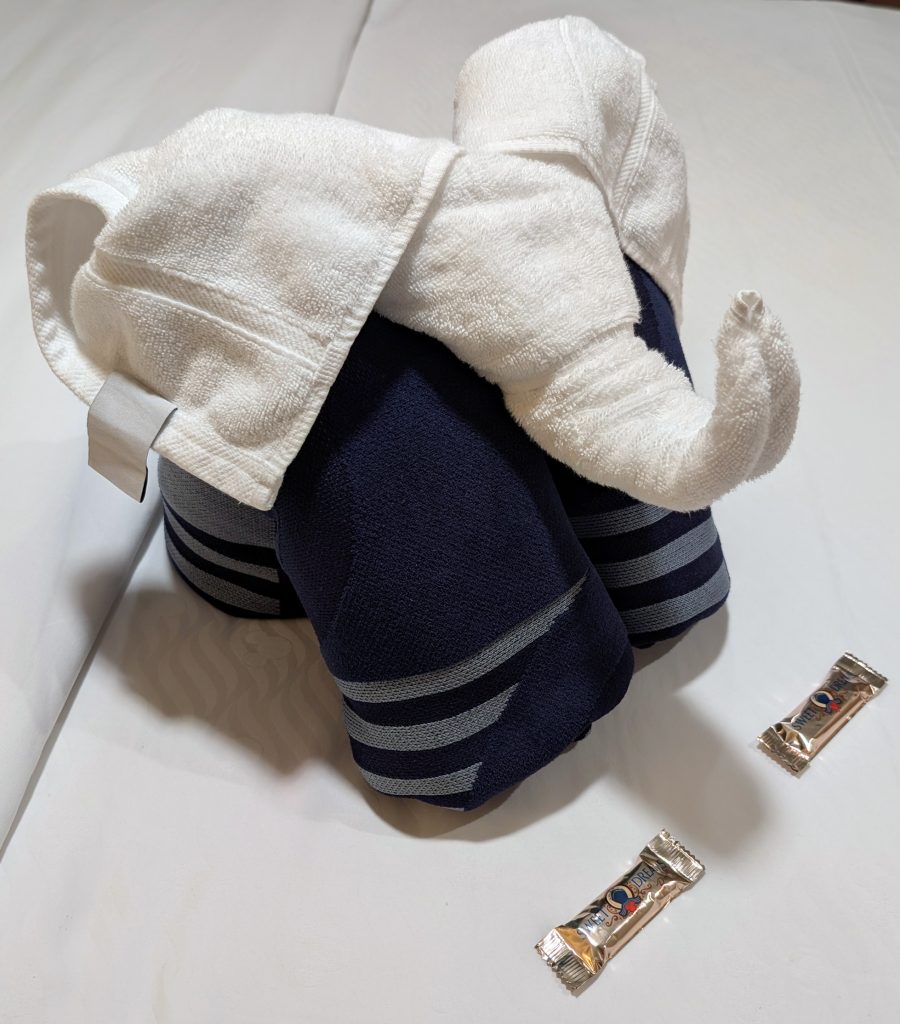 I stopped back in my room for a minute before dinner. Tonight’s towel animal was Dumbo…. or at least an elephant.