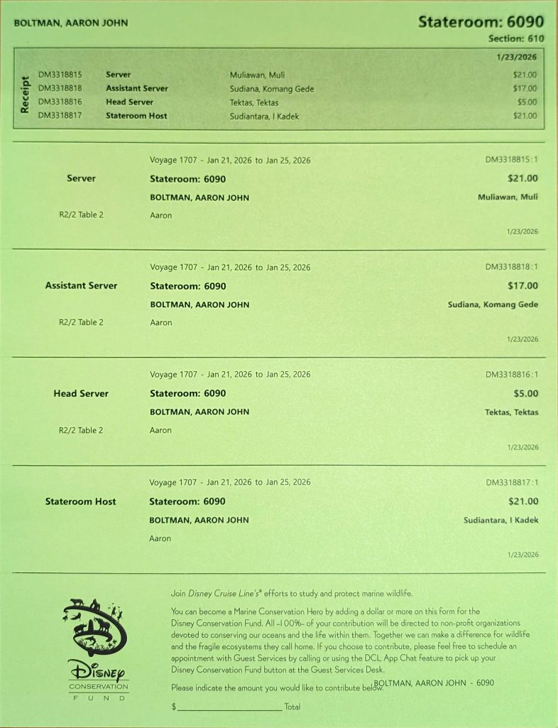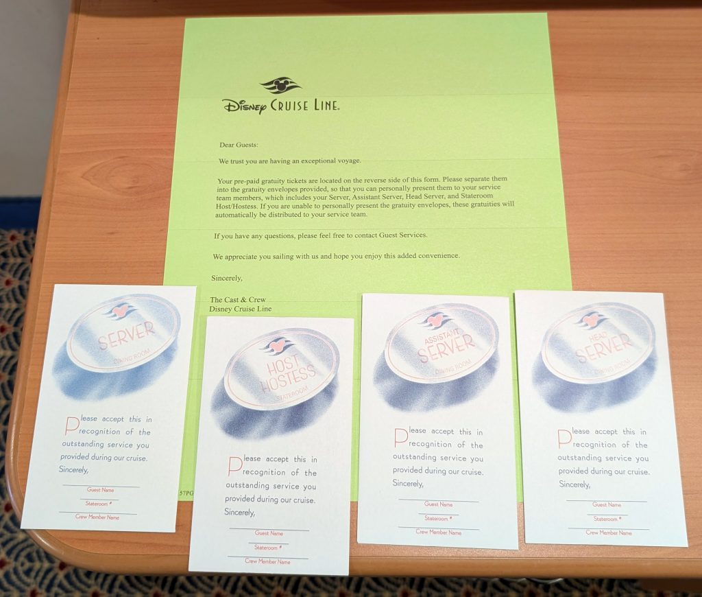They also dropped off the envelopes and vouchers in my cabin to give the crew for their gratuities.